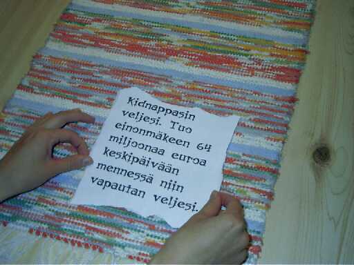 Maija luki lapon monta kertaa. Siinä luki joka kerralla näin: "Kidnappasin veljesi. Tuo einonmäkeen 64 miljoonaa euroa keskipäivään mennessä niin vapautan veljesi."